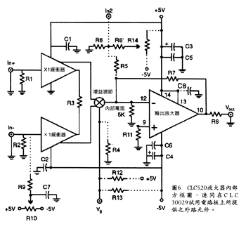 CLC520以一个14脚封装提供160MHz较大的频宽、40dB AGC范围、以及差分输入单端输出。这元件的最大增益由一个外接电阻预设,预设之增益可定于由+6dB 至最大+40dB。而设定在+6dB时,压控增益范围便从+6dB至少于-34dB,又设定在+40dB时,压控增益则由+40dB至少0dB。
