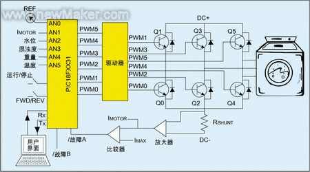图1:MCU在洗衣机中的应用实例: 8位微控制器驱动一个三相ACIM可变频驱动。 一个生产商的完全重新设计的洗衣机与传统的洗衣机相比较,减少消耗38%的电量和17%的水。电机控制MCU根据洗衣量和类型调整电机的功率。然而,家电用户依然对最初的购买价格很敏感,因此生产商必须不断降低它们的开发和生产成本,以使更先进的电器能为更多的消费者所接受。